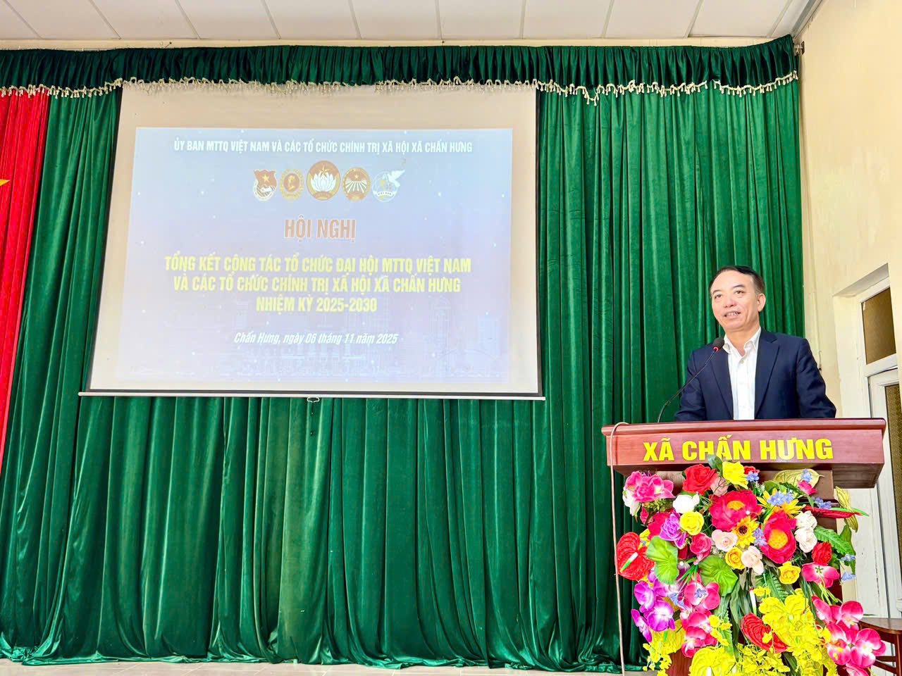 Chiều ngày 6/11/2025, tại Hội trường Đảng ủy xã Chấn Hưng, Ủy ban Mặt trận Tổ quốc Việt Nam xã tổ chức Hội nghị tổng kết công tác Đại hội đại biểu MTTQ Việt Nam xã Chấn Hưng lần thứ I, nhiệm kỳ 2025–2030.