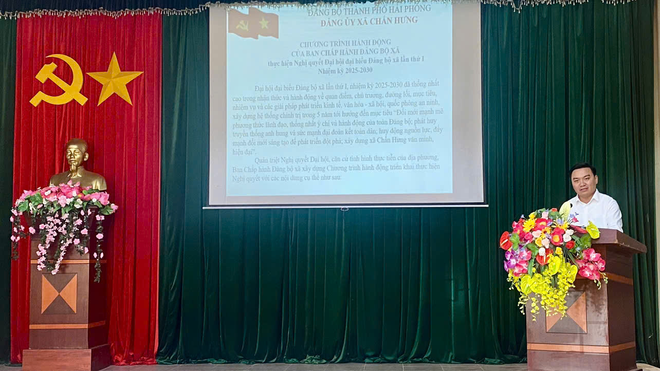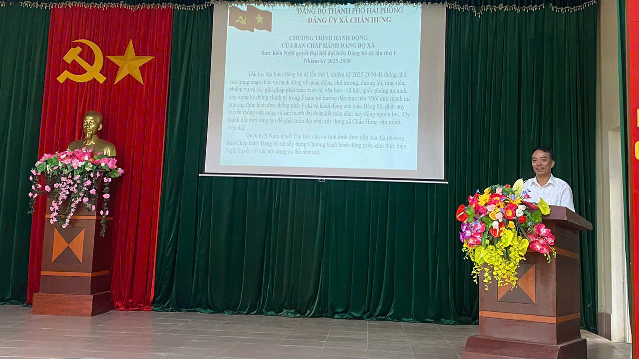 Tại hội nghị, đồng chí Vũ Văn Hè – Phó Bí thư Thường trực Đảng ủy xã đã thông tin khái quát kết quả và thành công của Đại hội đại biểu Đảng bộ xã lần thứ I, nhiệm kỳ 2025-2030. Đại hội đã xác định chủ đề xuyên suốt: “Đổi mới phương thức lãnh đạo, thống nhất ý chí và hành động của toàn Đảng bộ; phát huy truyền thống anh hùng và sức mạnh đại đoàn kết toàn dân; huy động nguồn lực, đẩy mạnh đổi mới sáng tạo để phát triển đột phá; xây dựng xã Chấn Hưng phát triển văn minh, hiện đại"