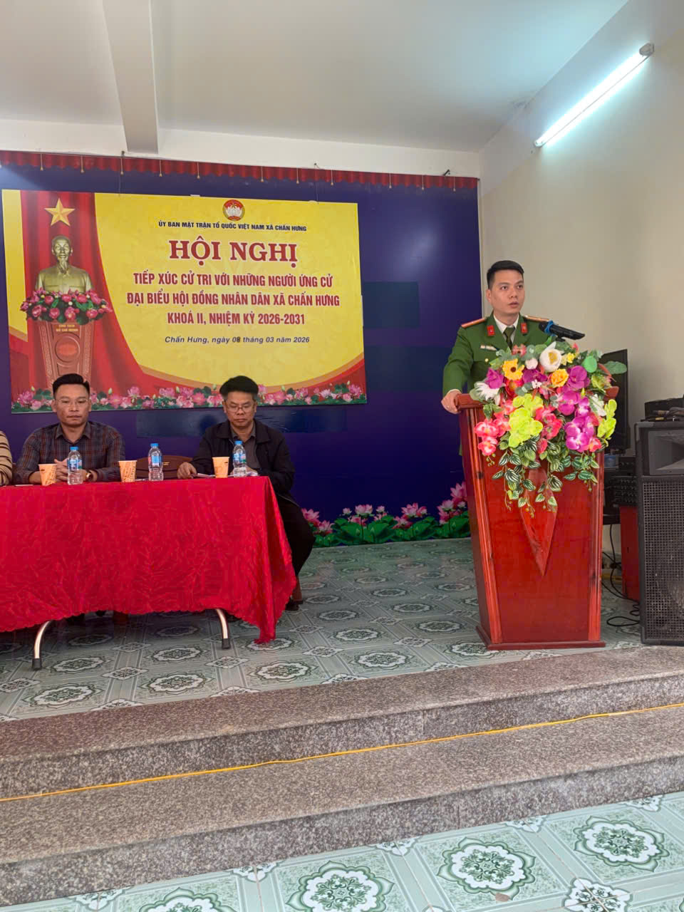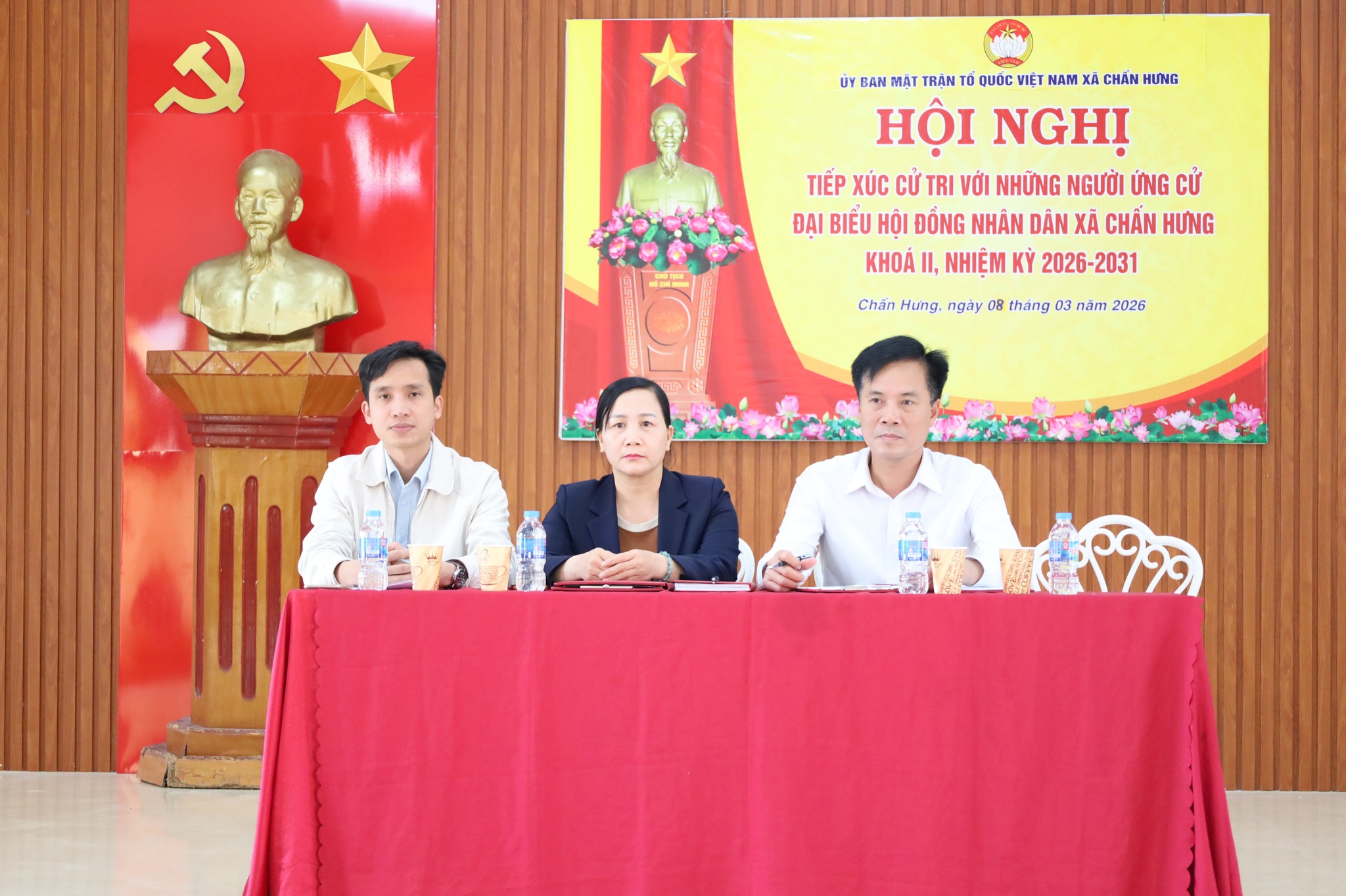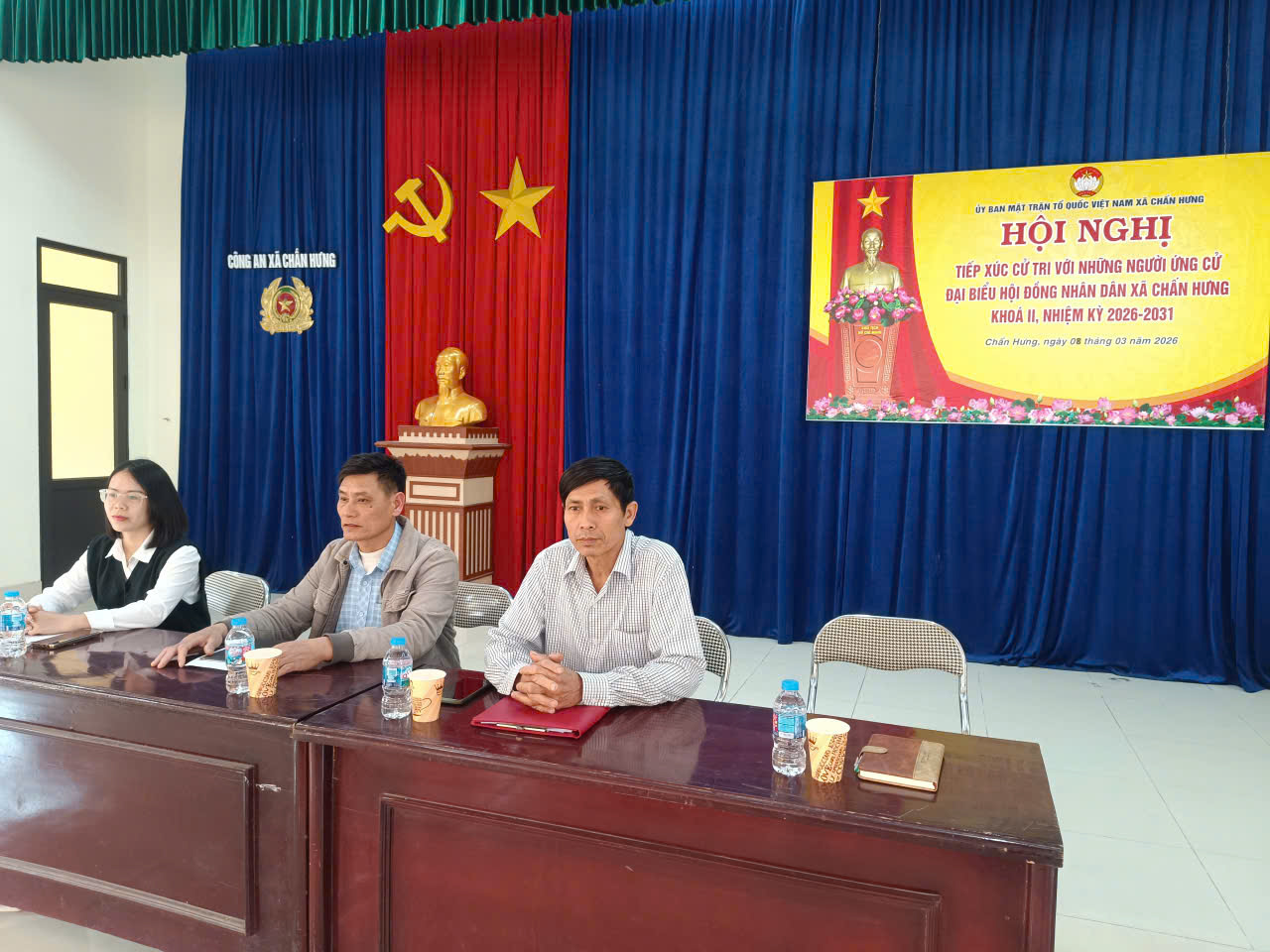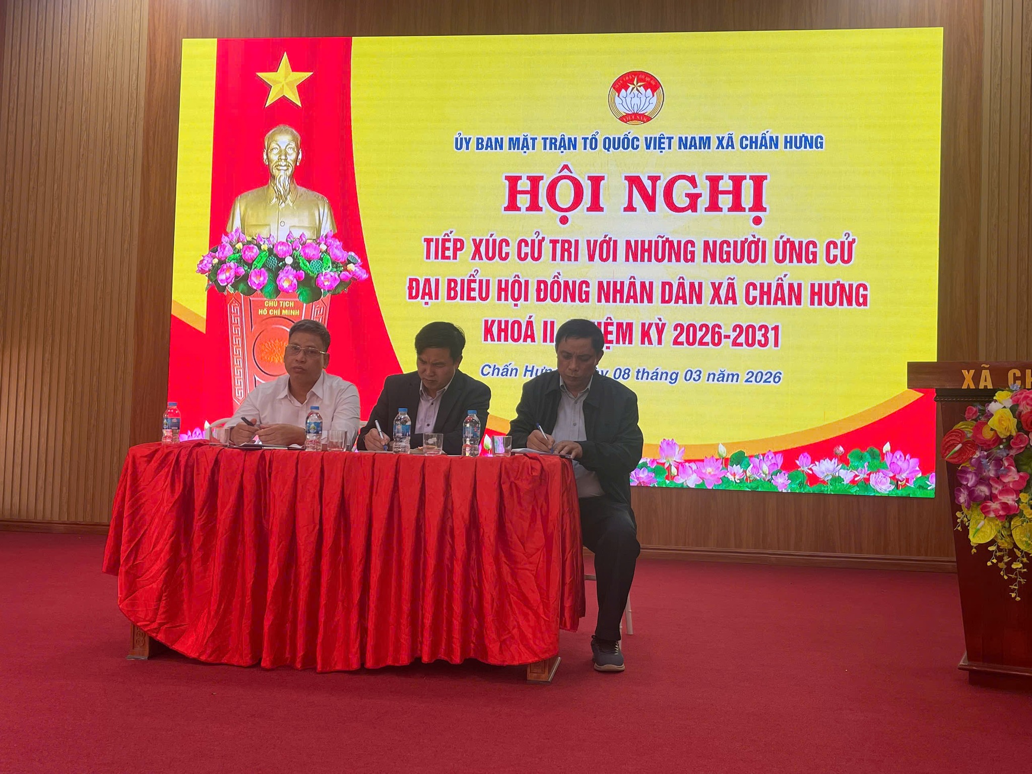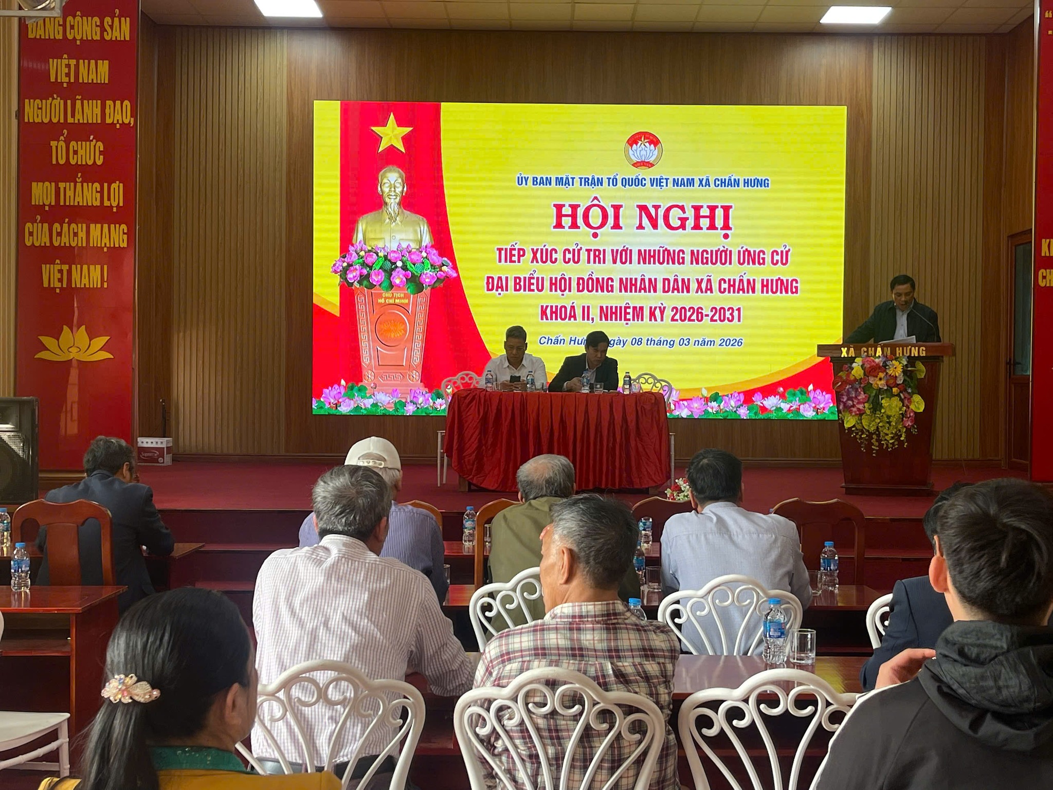 Chiều ngày 08/3/2026, các ứng cử viên đại biểu HĐND xã Chấn Hưng khóa II, nhiệm kỳ 2026 – 2031 đã tổ chức các hội nghị tiếp xúc cử tri, vận động bầu cử tại các đơn vị bầu cử trên địa bàn xã. Các hội nghị được tổ chức nghiêm túc, đúng quy định, tạo điều kiện để cử tri gặp gỡ, lắng nghe chương trình hành động của các ứng cử viên trước ngày bầu cử.