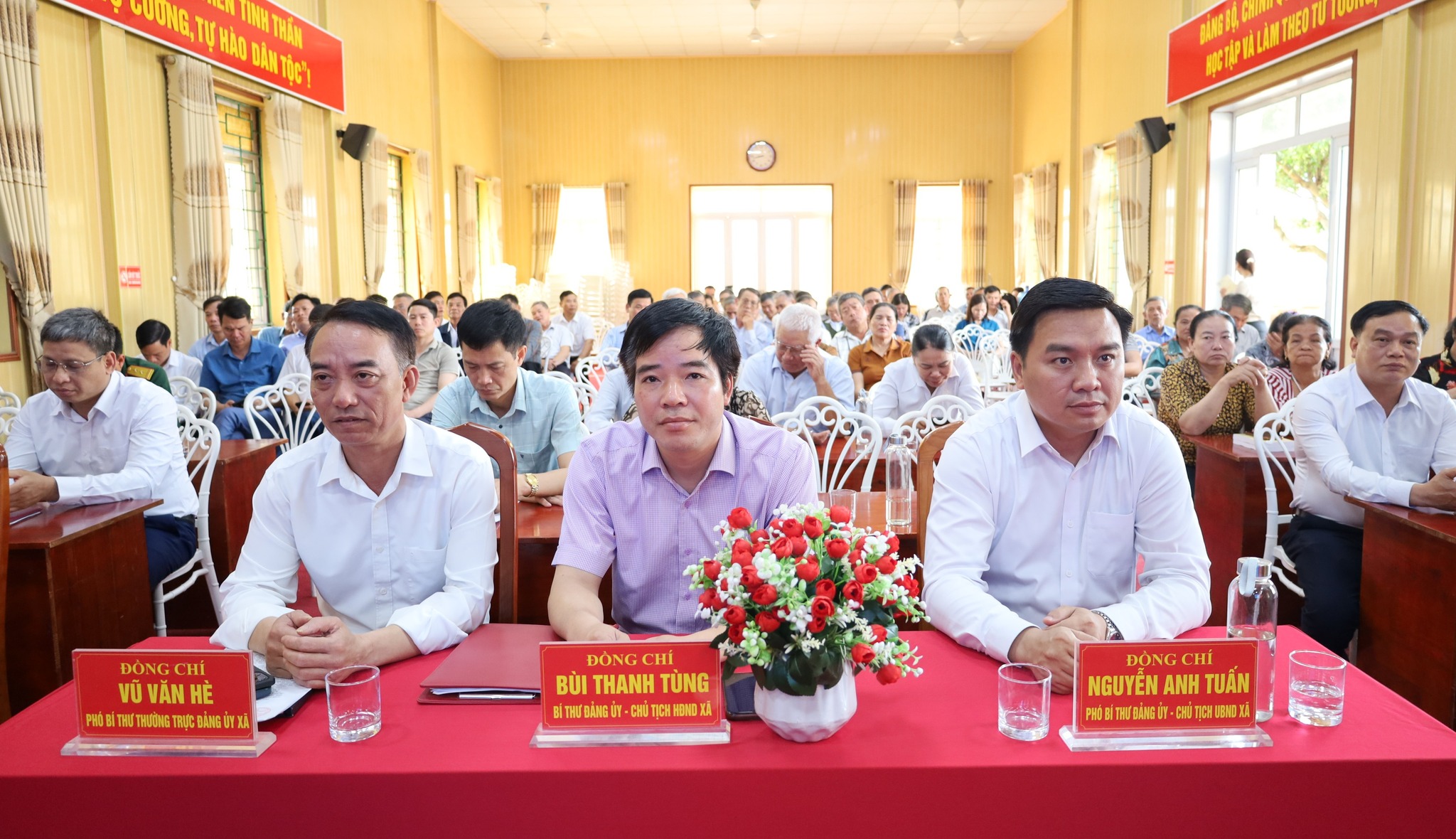 Tham dự hội nghị có các đồng chí: Bùi Thanh Tùng – Bí thư Đảng ủy, Chủ tịch HĐND xã; Nguyễn Anh Tuấn – Phó Bí thư Đảng ủy, Chủ tịch UBND xã; Vũ Văn Hè – Phó Bí thư Thường trực Đảng ủy cùng đông đảo cán bộ, công chức, đại diện các thôn và các tập thể, cá nhân tiêu biểu.