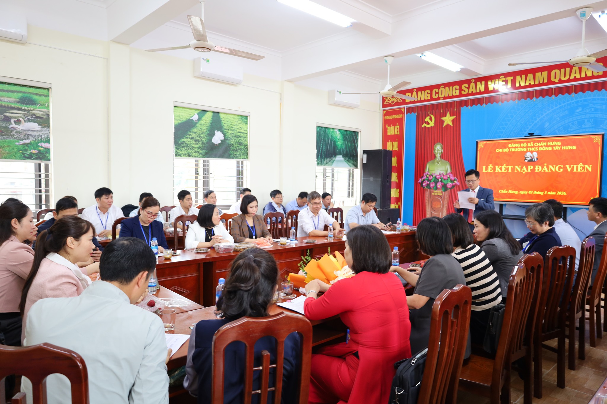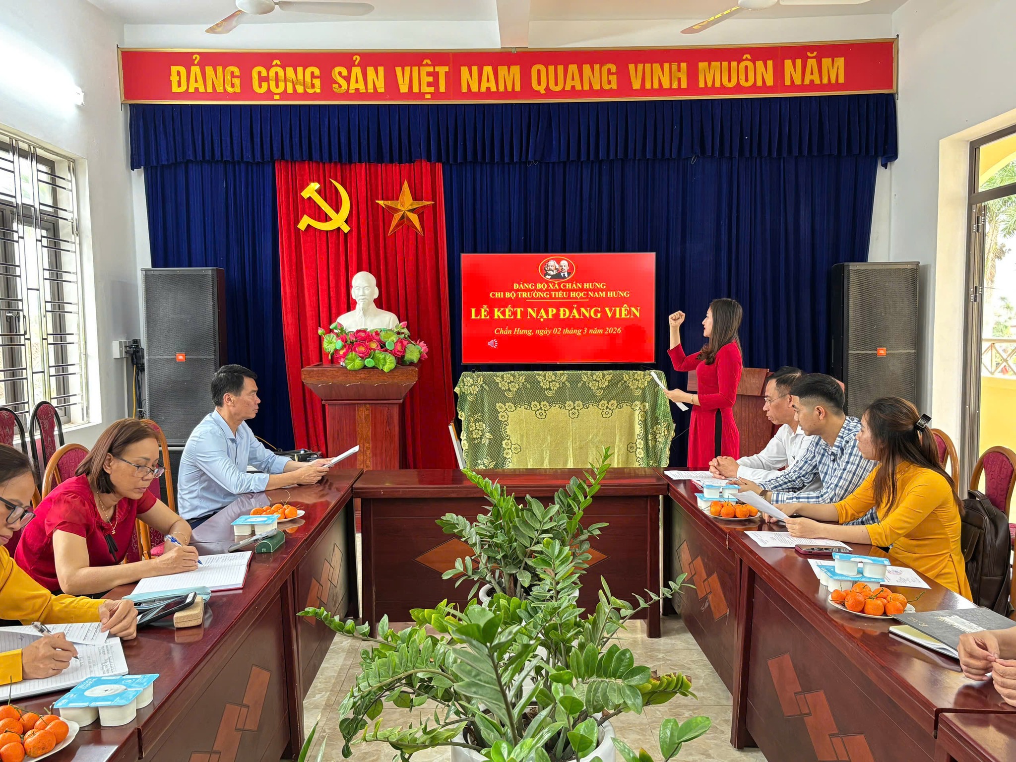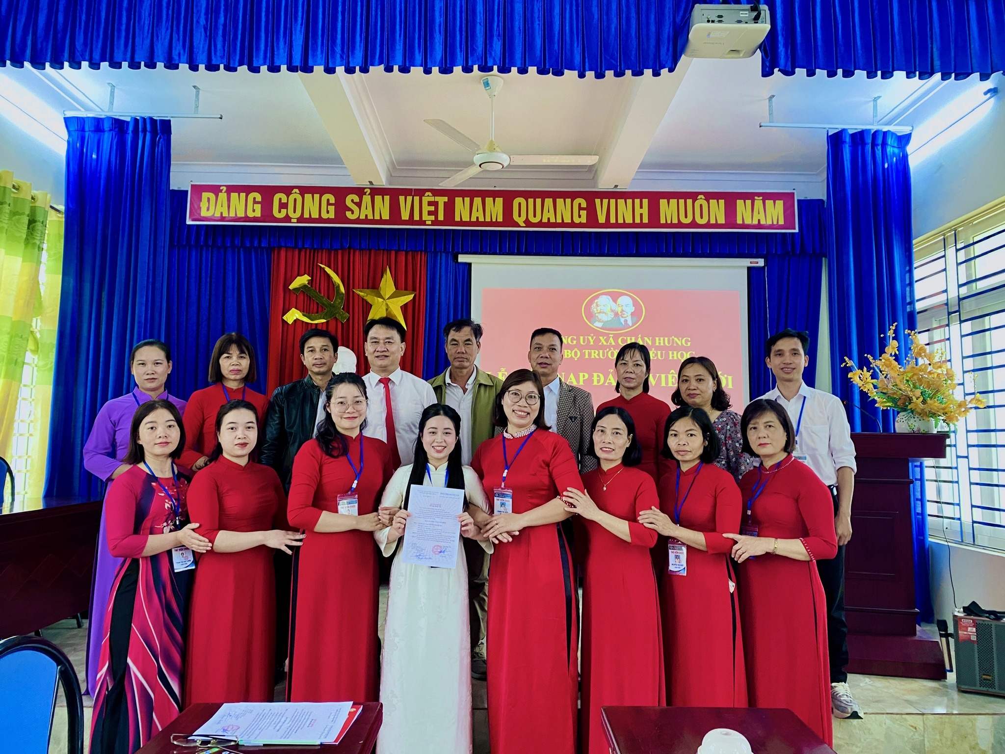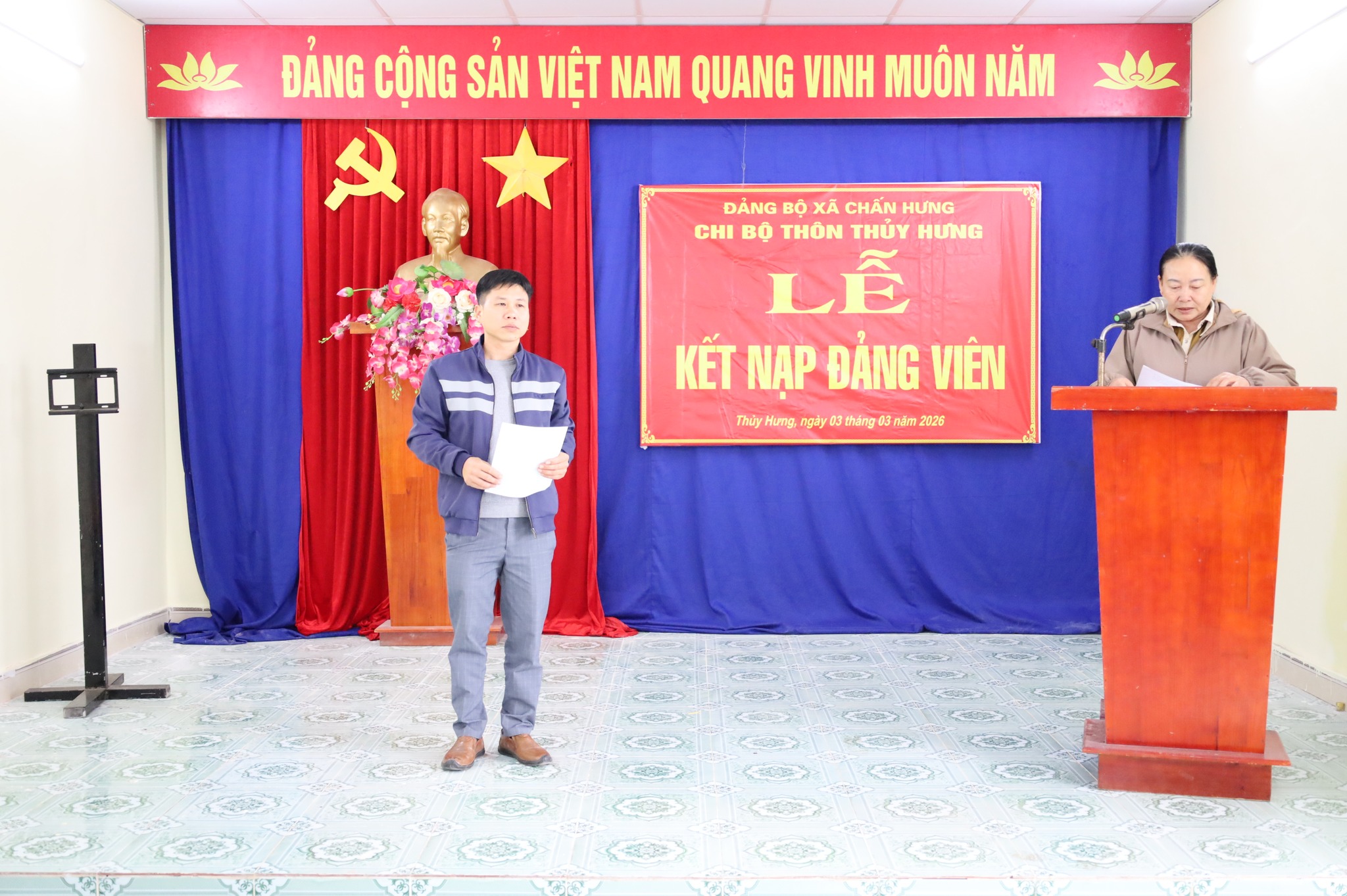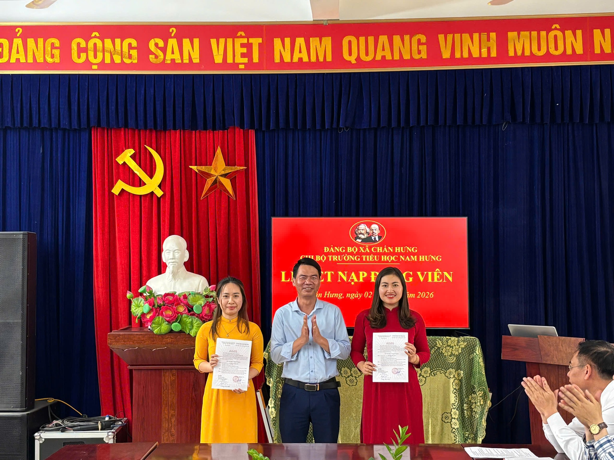Chiều ngày 02/3/2026 và 03/3/2026, các chi bộ trên địa bàn xã Chấn Hưng đã tổ chức Lễ kết nạp đảng viên mới cho 5 quần chúng ưu tú, gồm: Chi bộ Thôn Thủy Hưng (01 đồng chí), Trường Tiểu học Nam Hưng (02 đồng chí), Trường Tiểu học Tây Hưng (01 đồng chí) và Trường THCS Đông Tây Hưng (01 đồng chí).