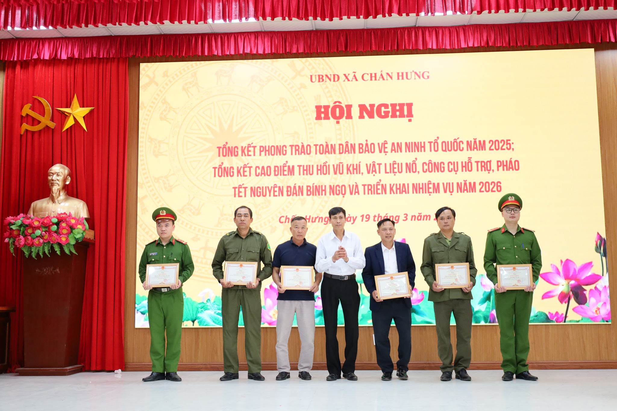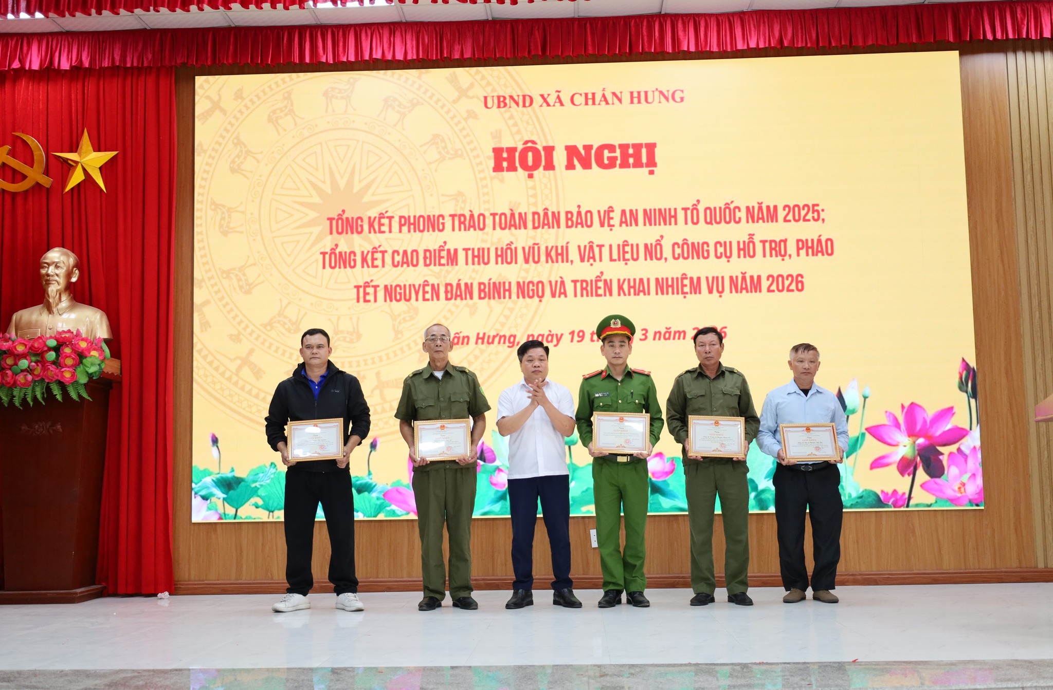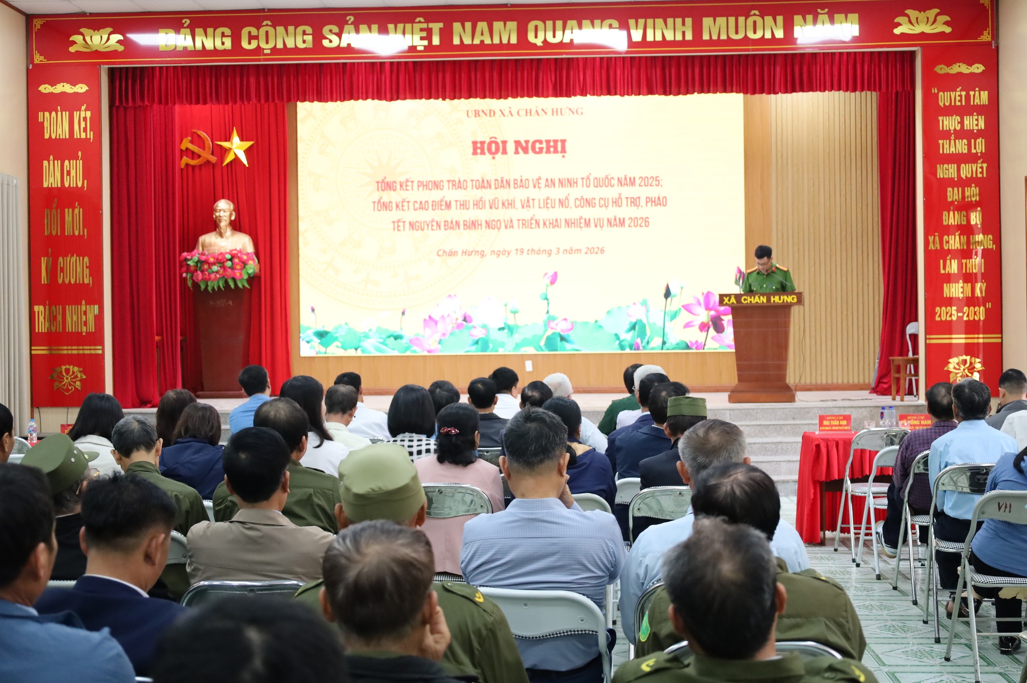Sáng ngày 19/3/2026, tại Hội trường UBND xã Chấn Hưng đã tổ chức Hội nghị tổng kết phong trào “Toàn dân bảo vệ an ninh Tổ quốc” năm 2025; tổng kết cao điểm vận động thu hồi vũ khí, vật liệu nổ, công cụ hỗ trợ, pháo dịp Tết và triển khai nhiệm vụ năm 2026.