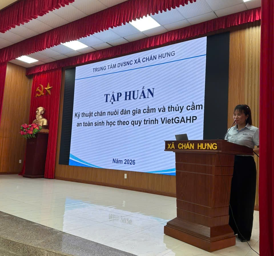Sáng ngày 20/4/2026, tại hội trường nhà văn hóa xã, Trung tâm Dịch vụ sự nghiệp công xã Chấn Hưng phối hợp với Phòng Kinh tế tổ chức lớp tập huấn kỹ thuật chăn nuôi đàn gia cầm và thủy cầm an toàn sinh học theo quy trình VietGAP cho gần 100 đại biểu là các hộ chăn nuôi tiêu biểu trên địa bàn xã.